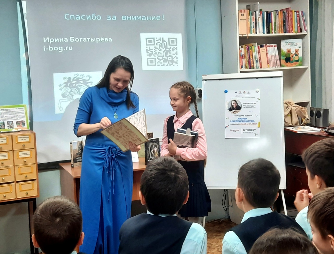 Ирина Сергеевна представила книгу "Лисичка в берëзовой шапочке", в которой собраны алтайские сказки в авторском изложении. Ребята, пришедшие на встречу, заранее познакомились со сказками и получили возможность задать все вопросы, которые возникли у них при чтении.