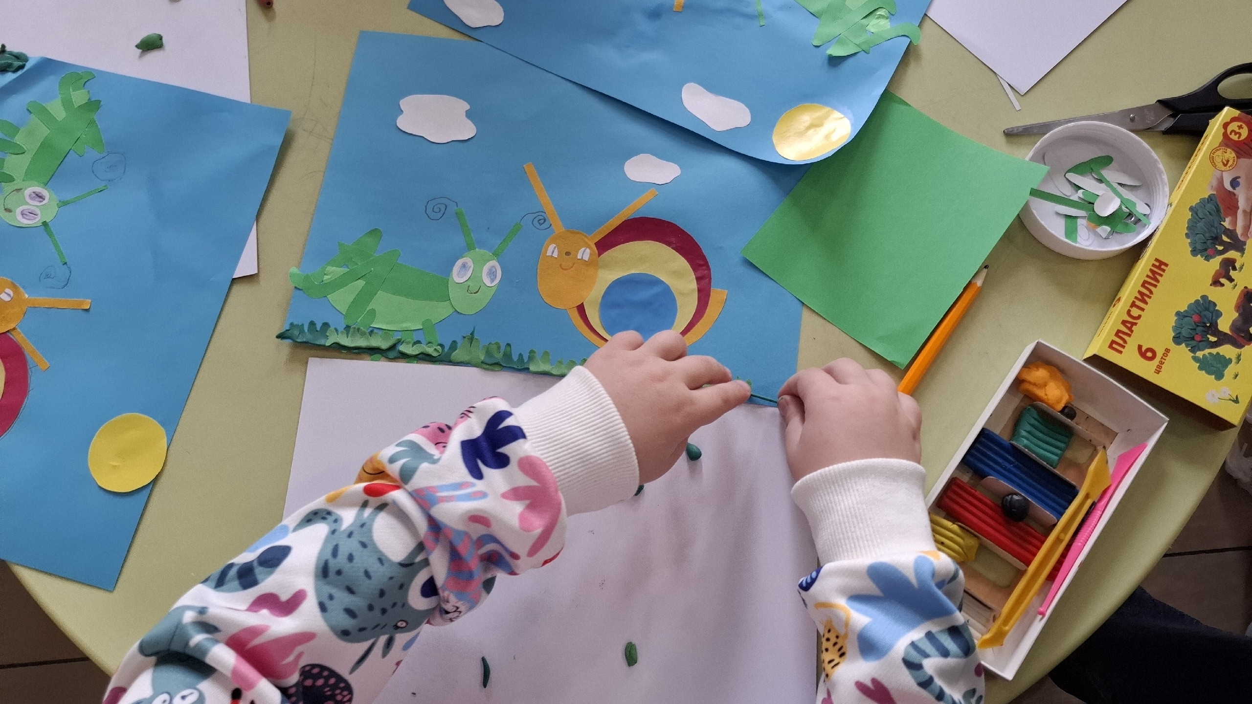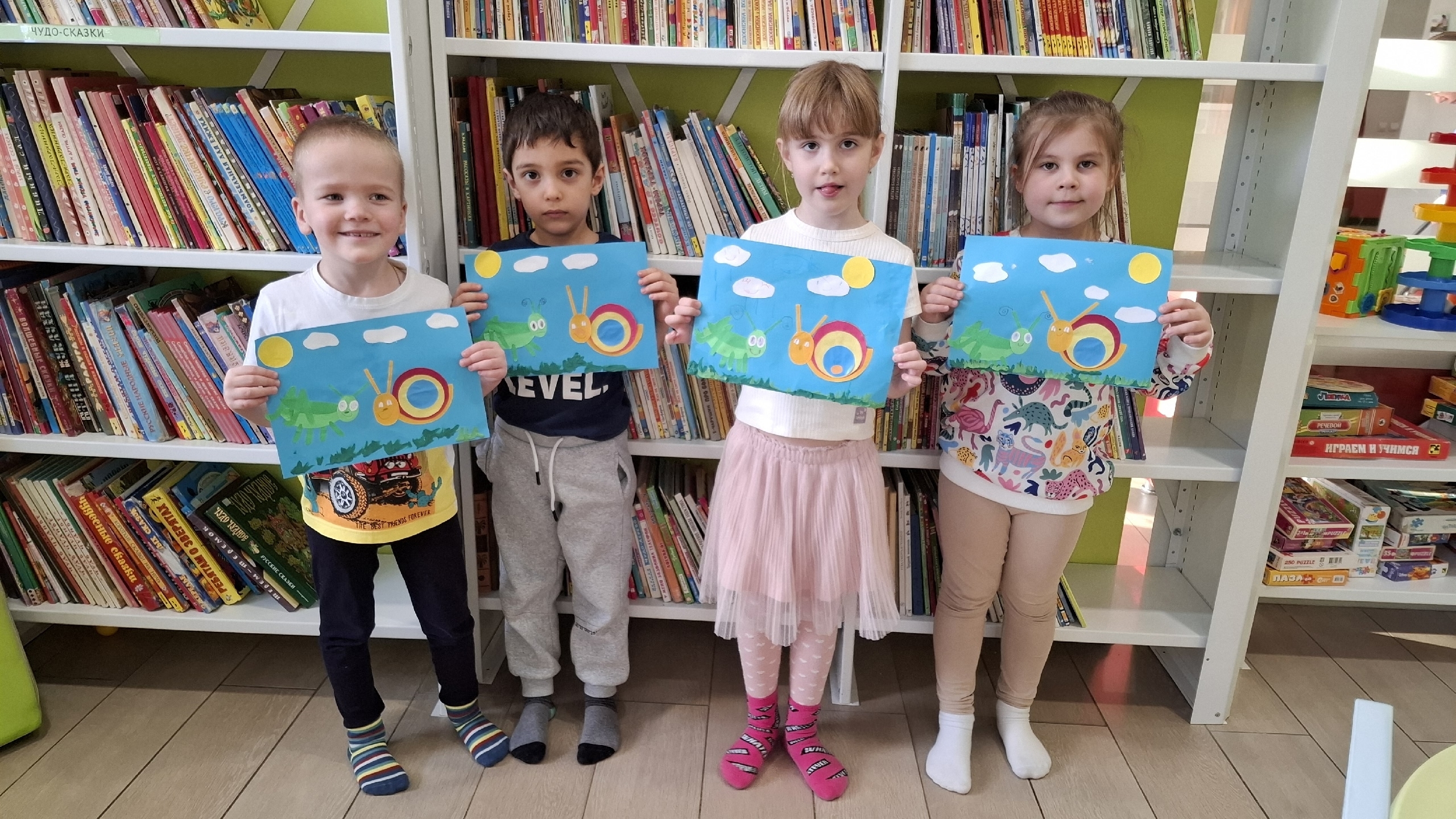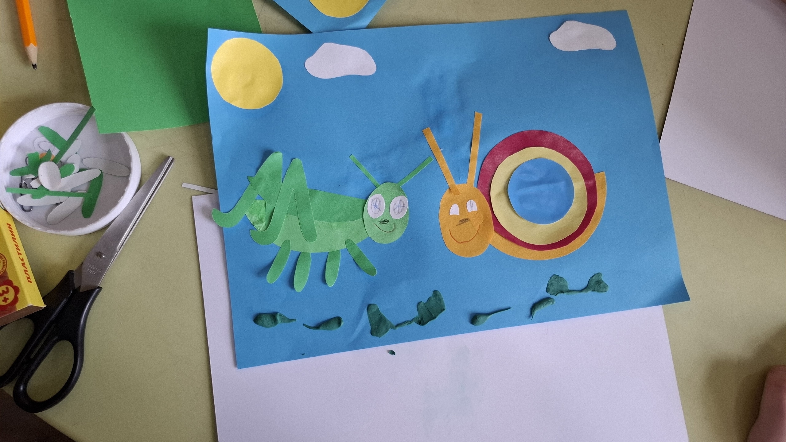 Прослушав произведение Дональда Биссета "Кузнечик и улитка", ребятишки выполнили аппликацию, на которой изобразили главных героев сказки.