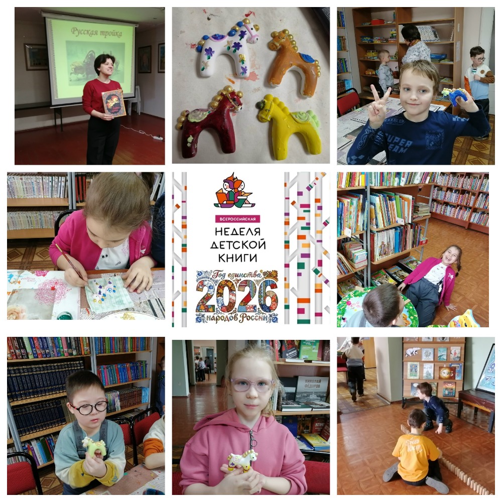 Сегодня участники Недели детской книги вспомнили сказки про коней, познакомились с различными техниками народной росписи – с изящными конями Плеха, яркими Городецкими коньками и немного забавной лошадкой Мезенской росписи. А в Северо – Двинской росписи есть кони голубого цвета! Есть легенда, что лошади такого цвета когда – то были на самом деле, но потом исчезли. Может, улетели в небо, предположили дети.
