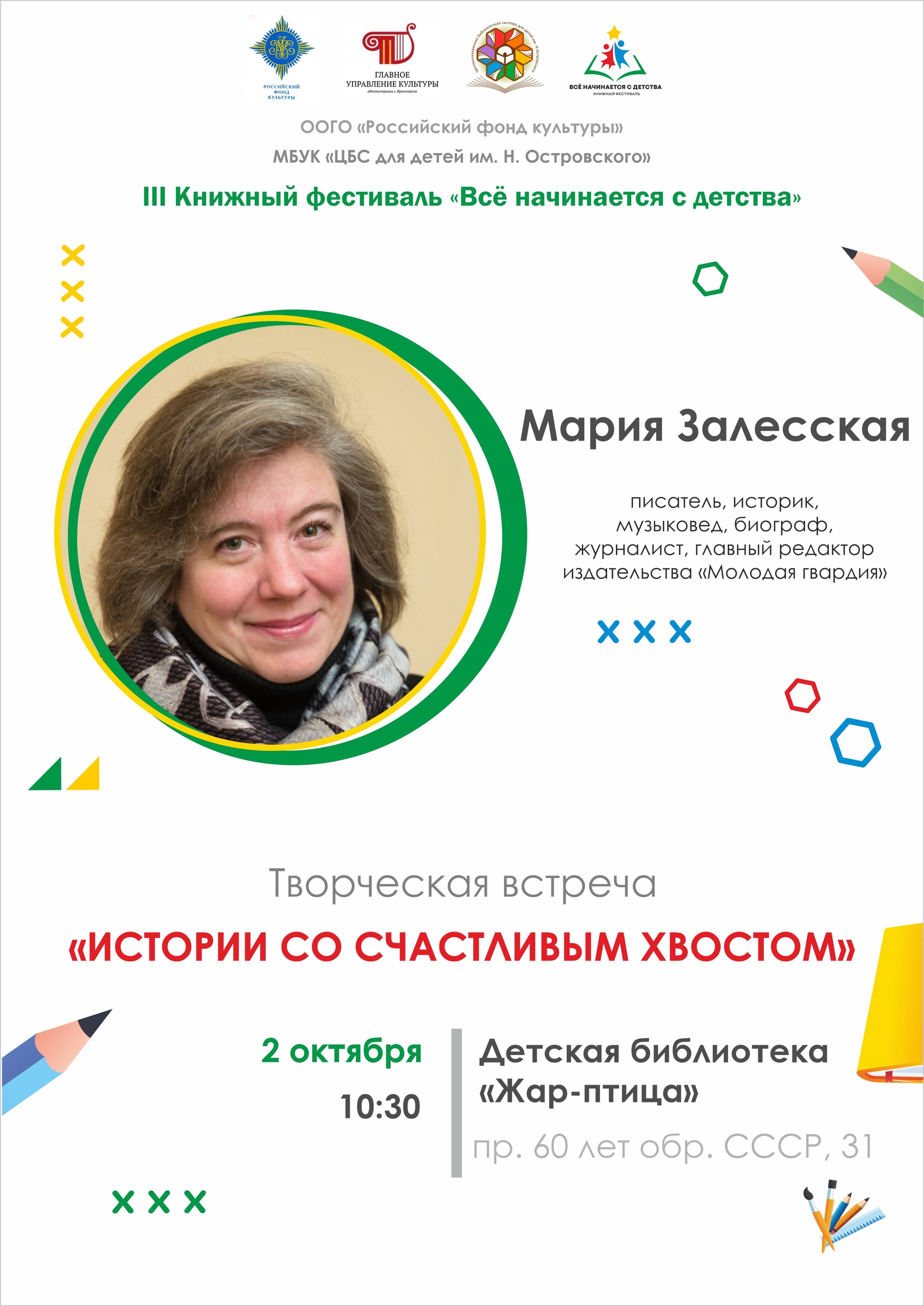 В рамках III Книжного фестиваля "Всё начинается с детства" 2 октября в 10:30 в библиотеке "Жар-птица" состоится творческая встреча с писателем, историком, журналистом Марией Кирилловной Залесской.
