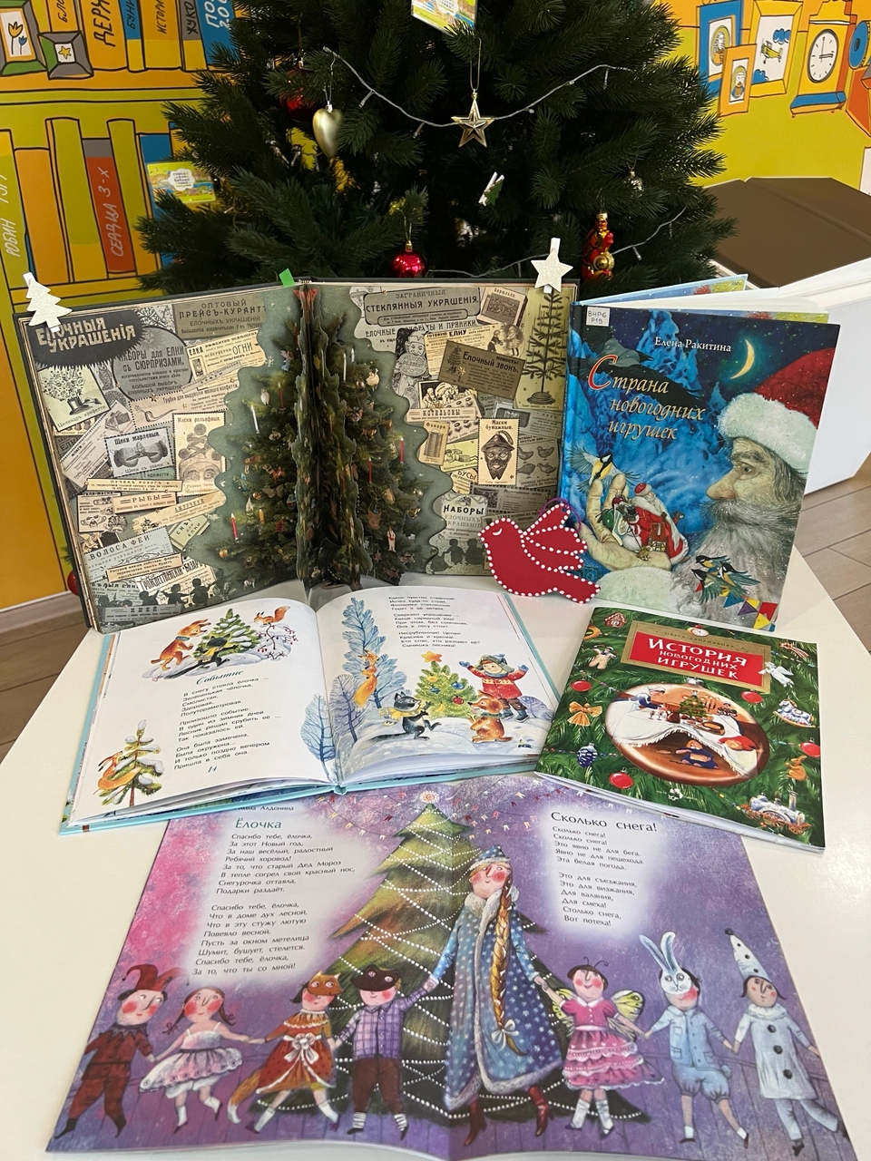 На познавательном занятии читатели узнали историю появления новогодних игрушек, рассмотрели виды старинных игрушек - картонажные, бонбоньерки, игрушки из ваты, съедобные игрушки, игрушки из соломы и цветных лоскутков. А после чтения новогодней сказки создали ёлочное украшение "Снегирь" в технике пуантилизм.