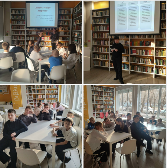 Отвечая на вопросы мини-викторины, школьники вспомнили профессии литературных героев, совместно с библиотекарем поразмышляли о трех факторах "хочу", "могу", "надо", которые необходимо учитывать при выборе главного дела своей жизни.