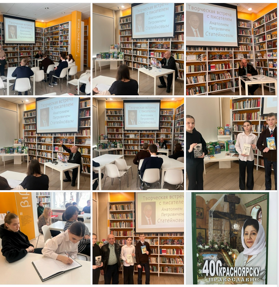 Вчера в библиотеке состоялась творческая встреча учащихся 7"Б" класса МАОУ СШ №46 г. Красноярска со Статейновым Анатолием Петровичем - известным красноярским писателем и издателем , автором множества познавательных книг о родном крае, его истории и животном мире, о городе Красноярске, о наших знаменитых земляках.