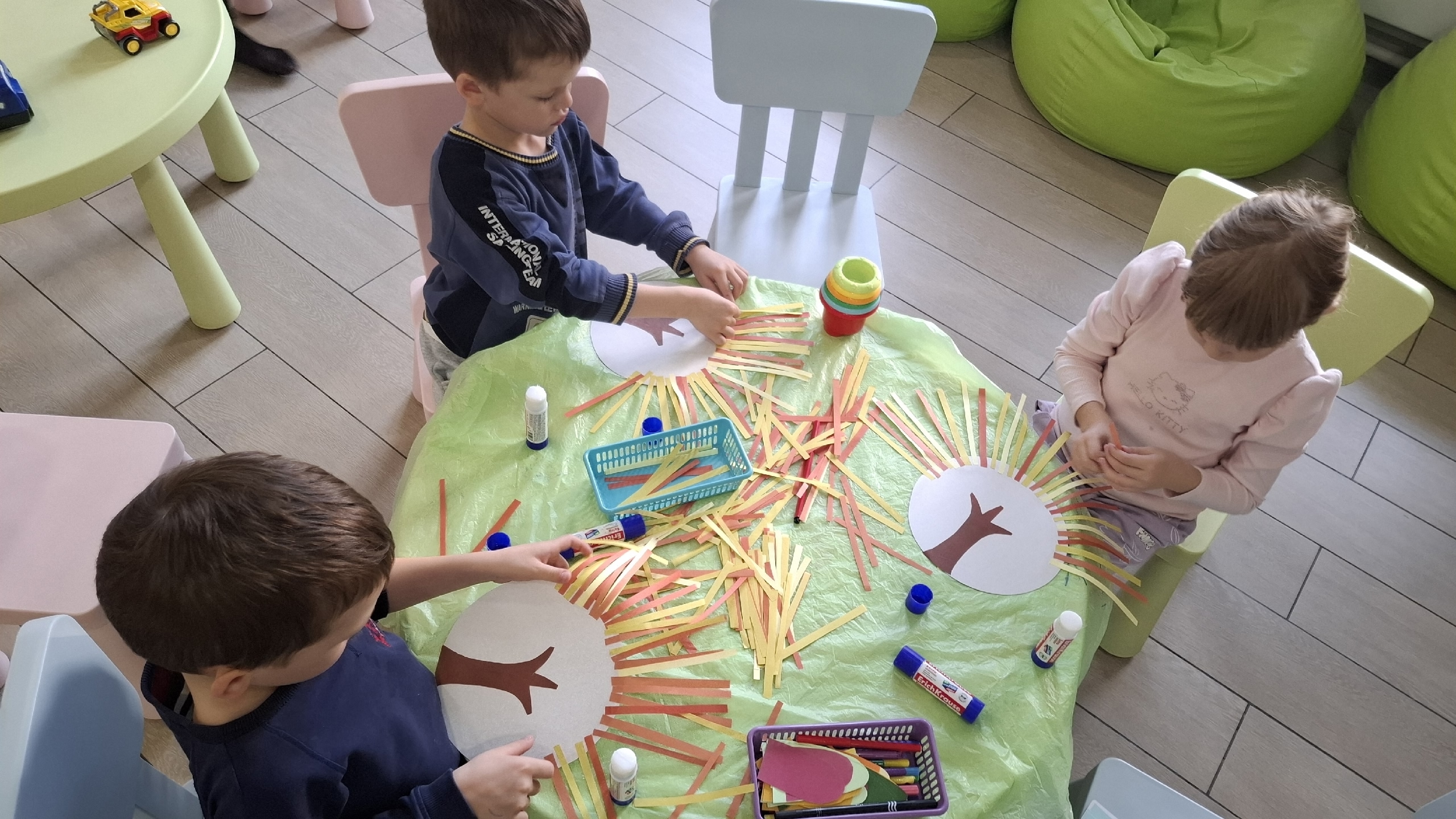 Сегодня ребятишки слушали сказку Николая Грибачёва "Рыжие листья", их которой узнали, что некоторые звери в лесу готовятся к зимней спячке, зайцы меняют шубку, белки готовят запасы. А затем мы сделали две аппликации на тему "Осень".